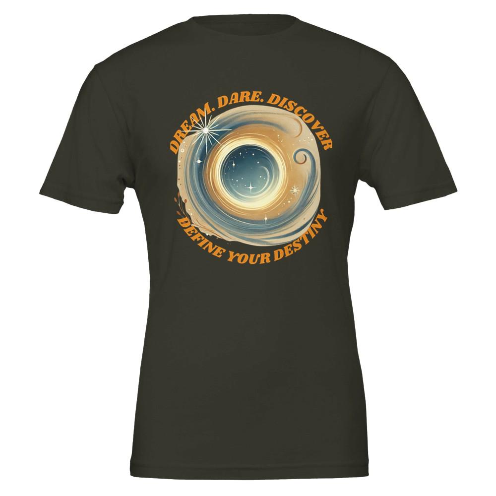 "Dream.Dare. Discover" T-shirt—a simple yet powerful statement for those who refuse to settle. Crafted from soft, breathable fabric, this tee combines comfort with inspiration, making it perfect for dreamers, go-getters, and anyone ready to turn aspirations into reality. The bold "Dream.Dare.Discover" print serves as a daily reminder to pursue your goals fearlessly, and its minimalist design makes it a versatile addition to any wardrobe. Wear it to inspire yourself and others—because big dreams deserve to be worn with pride. Dream big, and let this T-shirt be the beginning of something extraordinary.